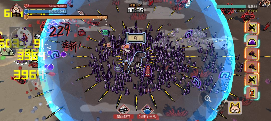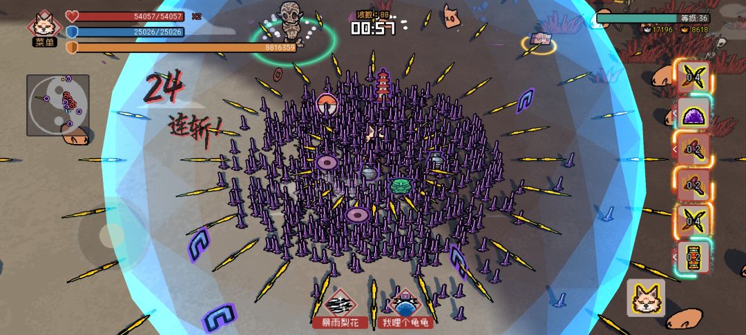 无尽刷怪很快不能像普通模式慢慢运营,开始小鬼+聚宝盆刷钱,兔子组合快速刷金矿和银矿顺便用被动献祭增加基础属性,在加上锤子+飞刀增加生存率,顺便打输出冷却快,没事就看看货郎里面有没有蓝色、紫色的技能,3-4波左右就可以把兔子组合通过货郎换掉,最好是紫色技能,就可以换陨石+喷火回血回盾,把锤子和飞刀升到蓝色或者紫色,现在不站桩生存拉满,矿提供的经济可以代替小鬼组合就换金色的梨花针,可以用来献祭提升基础属性,最后一个技能先不着急选暴雨针合成神通,属性值太低没什么伤害,可以选择金色的寻了多少鸟剑,自动索敌,伤害可以,十几关左右经济足够、属性起来了,可以换技能合成暴雨梨花针×2续航强没有空隙,还有铸甲柱和龟壳,70-80关以后站桩输出被boss围殴瞬间几十万的盾就没了,把生存拉满,后面就是站桩割草挂机了,上班摸鱼等下班,90关左右就退了,没有娱乐性了