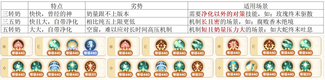 上述表格挑了比较经典的举例,在奶量压力不大的情况下,三五奶确实相对万金油,基本上纯五能用的场景,三五都能用,在练度合适,且纯五较吃力时,不妨换三五一试。