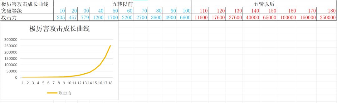 变化原因:五转后开放140招式等级,其中大攻击成长曲线发生质变