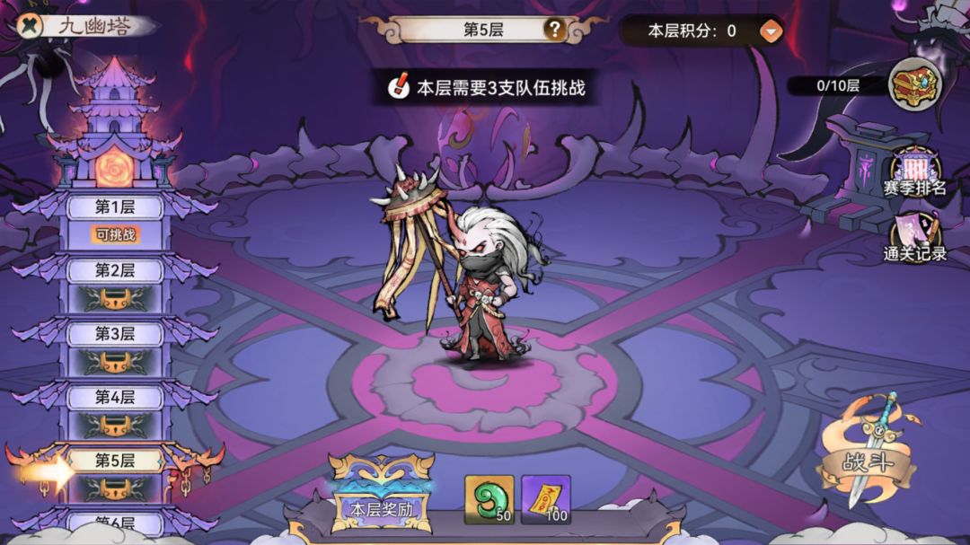 九幽塔的挑战分为普通层和精英层,通关普通层可固定获得5点挑战积分,而精英层获得的积分则与通关所用回合数有关,所用回合越少,分数越高。