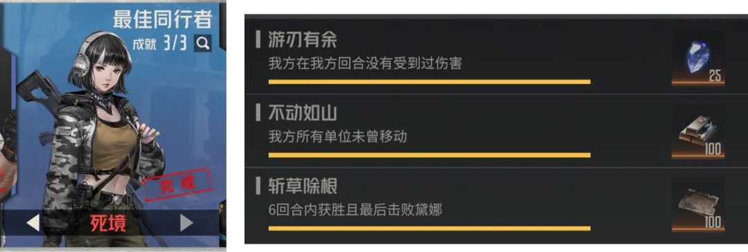第一关“行至米赫玛”,其死境难度其实想要一次性完成3个成就也不算很困难,咱们需要注意的就是不要打桩子给打到1点血即可,此外3回合获胜的关键就是需要上移动力和范围输出较强的角色了。