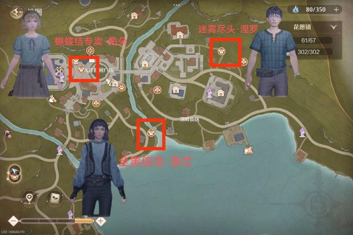 专卖蝴蝶结,位于花愿镇大树旁摊位,黑心扭蛋机隔壁