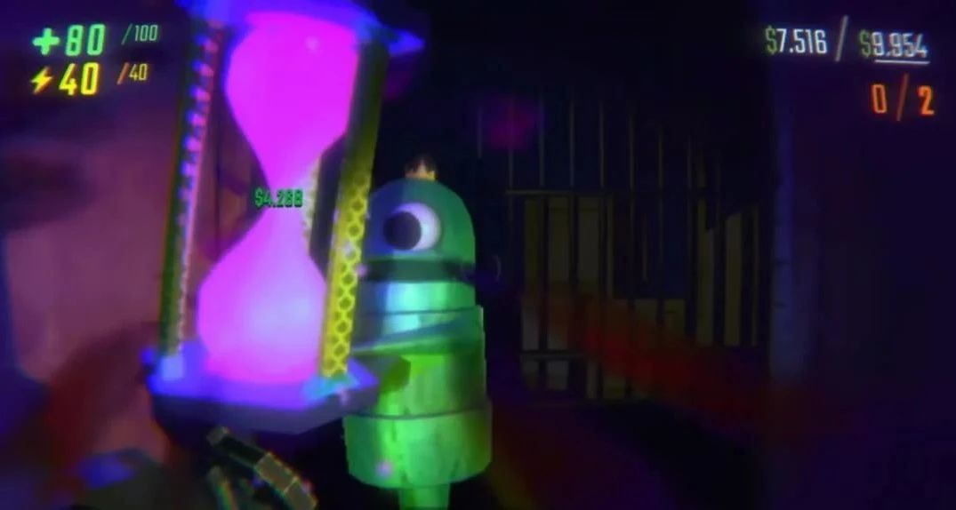 举起发着紫光的时间沙漏时,玩家会瞳孔放大,所有动作变慢,声音好似被大幅减速一般,发出咕噜咕噜的声音——如果多个玩家一起抓着沙漏,那场面看上去就像是集体魔怔一样;