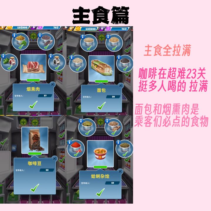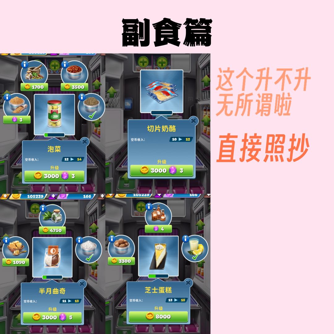🔹大家升级主食时可以不用按我图片里把上面的2-4个调料升完。因为调料升级花费的无论是金币and钻石,它所增加的食物单价只会是1块钱,这样是不划算的