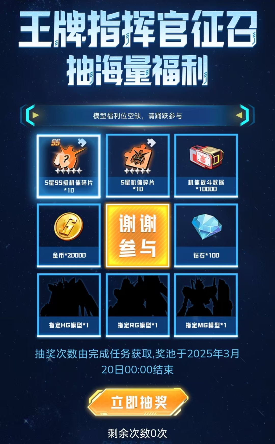 只需点击【此处】即可参与! 即日起,参与《高达钢铁之诗》官方发起的“王牌指挥官征召”活动,完成活动任务即可抽取包括正品HG模型、MG模型、RG模型、5星机体碎片、钻石、在内的丰富奖品!