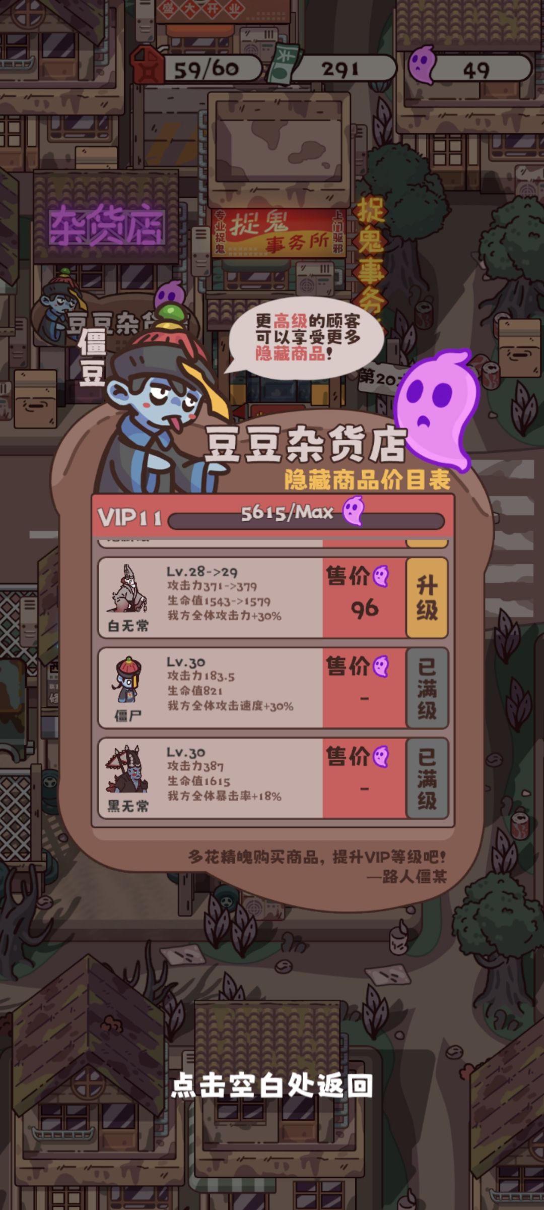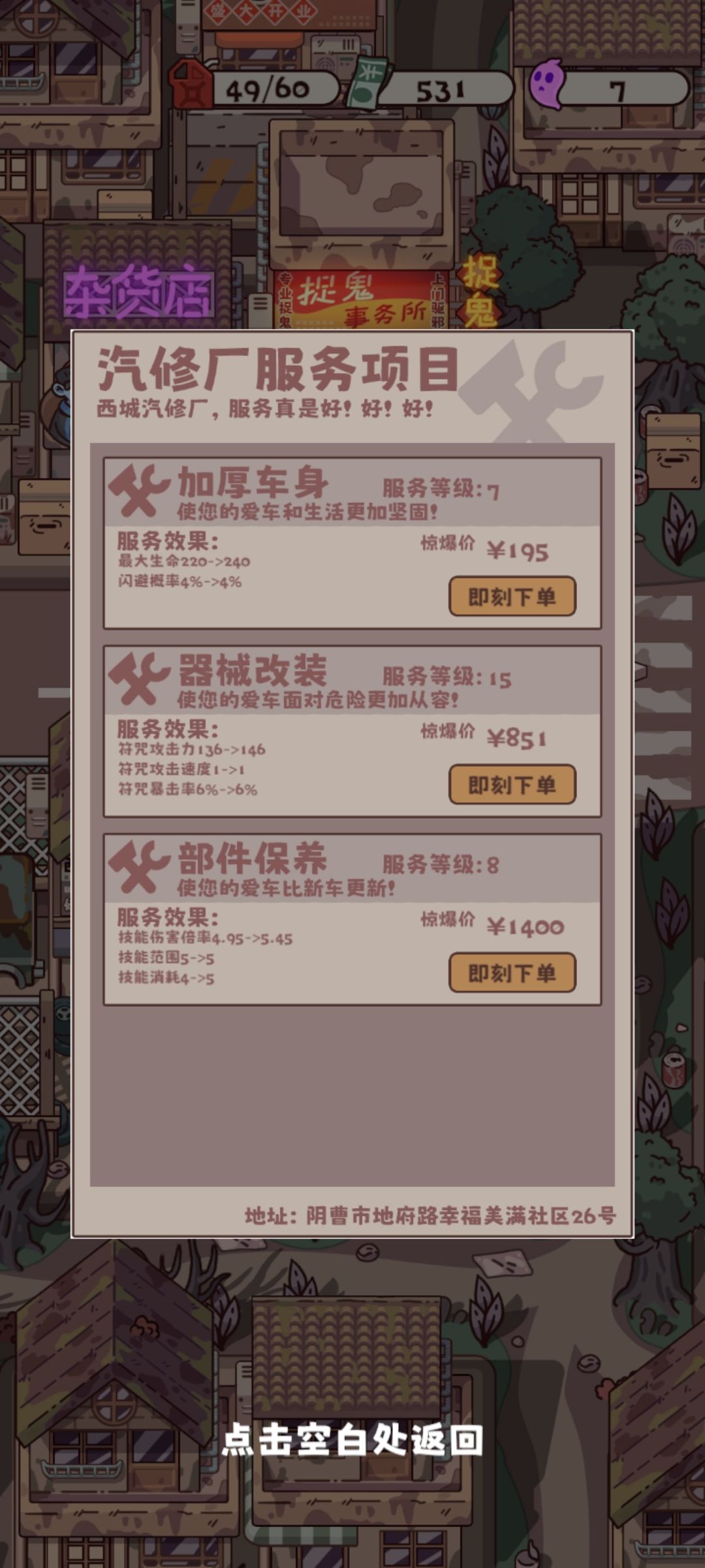 前期鬼物生狗和行尸就行,异鬼不太需要主要是把对面怪吸住放技能,钞票比魂有用蓝石其次黄纸一点用没有,然后正常打把僵尸刷出来,僵尸速度比较快再加上升级后的技能范围大伤害高对面棺材血薄,直接闪电战能过很多关(再看广告收益更高,不想看广告不要把主线刷太多,因为少打很多怪会亏一点收益,去刷无尽,这套打法前期可以省很多蓝石,后面遇见乘三可以刷很多蓝石走的更远),到这就主要升级僵尸(其他不是必须随便升升防一下空中)和车的改装和保养然后把黑无常刷出来就行。由于后面没有高品质的近战,(前排僵尸对僵尸)所以黑无常实际上没有克制,还有攻击范围远可以离很远直接攻击到车,还加暴击游戏基本没难度。白无常也挺强但是黑无常就够了![[表情_微笑]](https://img.tapimg.com/market/images/0f170d4b1ecf80c267e5a44b5992a199.png)