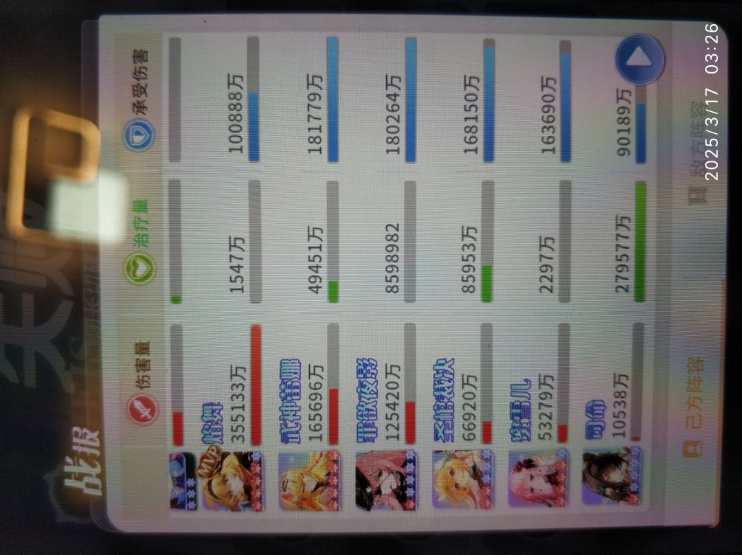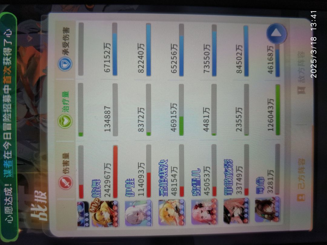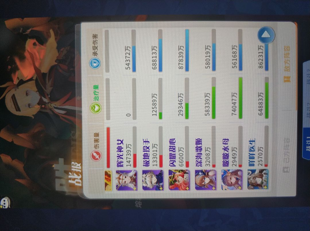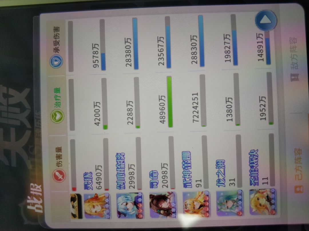 本期是按照角色登场顺序来写的,但是历火在出焰舞以后才有用,所以放在焰舞后面。作为大后期唯一强势的开服角色,可能很多人还不懂她的作用,历火是全游唯一一个全体减疗加真伤的角色,比如下图中5个治疗回复了20多亿血,焰舞配合满星莉莉丝根本打不过去,换成SSR4历火就刷过去了,我前两天推的治疗图,NPC总回复血量已经超过80亿血了,历火照样能过。