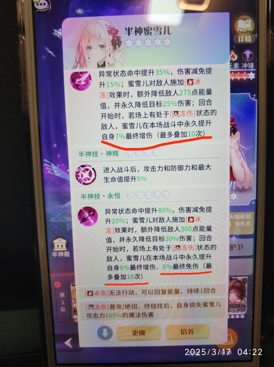 上面是7.3亿越战8.8亿,对面元素抵抗62%,我元素和古域克制只有40%,我伤害真要这么高我也不至于打这么多回合了。所以我自己弥撒至今没敢升专属,如果大佬们不介意花三五千拉满了,后期还进不去主队的话可以拉满。推荐免伤符文,满星弥撒的话可以满专,弥撒的专属还是很强的,带免伤专武(灵芽),羁绊推荐深海歌姬。