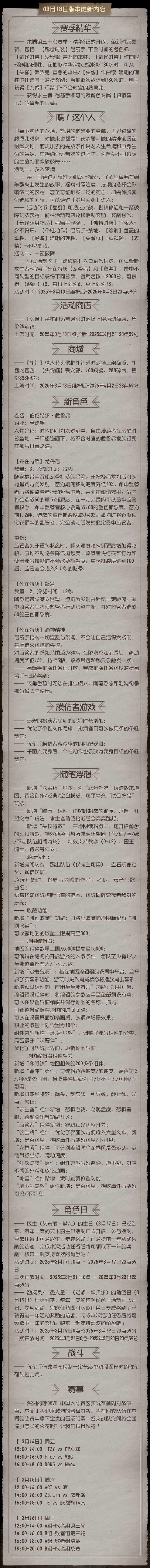 2025年3月13日维护公告: ——【赛季精华】:第三十七赛季·精华2正式开放,全新时装更新,包括:【稀世时装】弓箭手-不合时宜的危鲁弗、【奇珍时装】爱哭鬼-善恶的本性、【奇珍时装】作曲家-澄明的理性; ——【瞧!这个人】活动开启:完成剧情故事及活动任务可获得【奇珍随身物品】弓箭手-酩酊、【独特时装】守夜人-永不复焉、【个性动作】弓箭手-躺地、【涂鸦】善恶的本性、【涂鸦】澄明的理性、【头像框】-酒神颂、【表情】-不愧是我等奖励; ——【新求生者】弓箭手上线; 更多内容请点击长图了解~