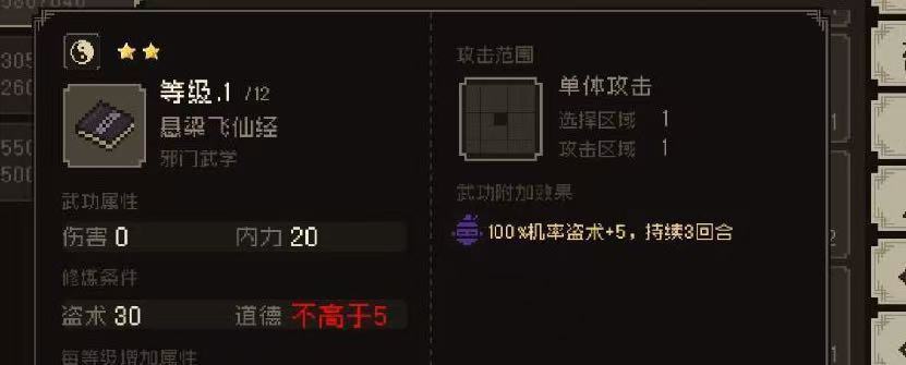 盗术高低决定你是否能偷到东西 越高级的东西需求盗术越高但是 盗术心法 悬梁飞仙经要求道德5。这个玩意是很重要的 虽然属性加的不多 但是这个附加盗术太有用了,后面偷破庙师兄啥的也是必学的东西。所以如果需要走捷径获得资源,道德一定不要升太高。不然还要想办法去降低道德就很麻烦了。