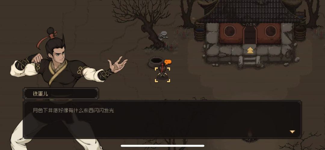 出庙后,左边有一只大黄狗,这个大黄狗需要喂羊肉馒头后就能加入队伍,目前身上没有,一会儿会去城里买。千万不要忘了,前期的队友非常稀缺。要尽快组建自己的队伍!