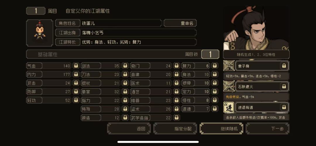 再不参考二周目的情况下,若喜欢高自由度和特殊流派可选择落魄小乞丐;想走江湖线高道德流派可选少室山孤儿;追求邪派或隐藏门派专属武学可选天摩小尼。我个人建议一周目推荐放牛娃拿左右穿花(双手互搏),后面周目继承这玩意就能随意按自己喜欢的来了。