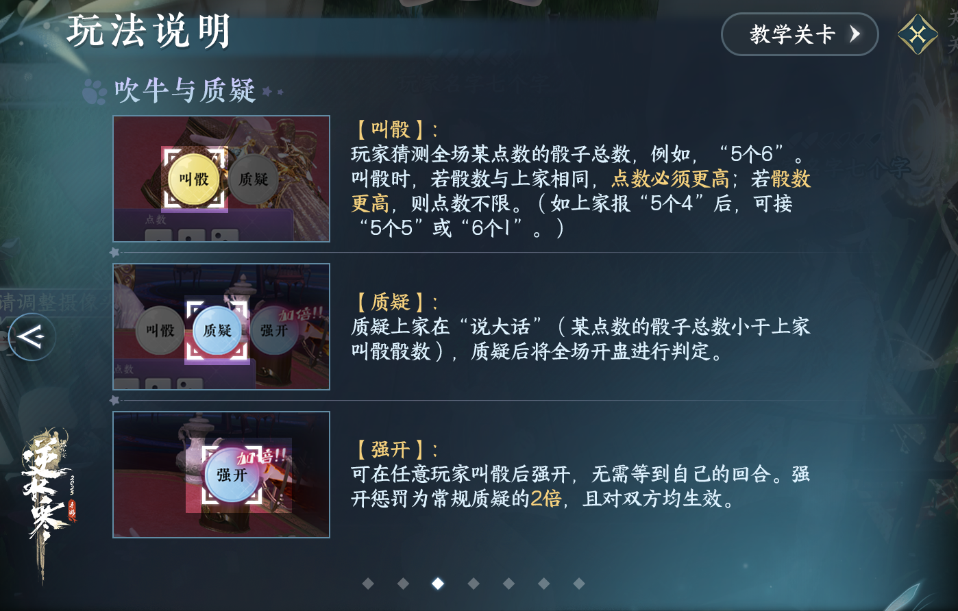 开局阶段,每位玩家将拥有5个骰子,摇完一次骰盅之后,全场玩家开始猜测牌桌上的骰子点数。玩家可以选择猜测骰子数量或质疑上家。当有玩家质疑上家后,将开启全部骰盅,检测骰面数量是否符合。输的玩家将受到惩罚。每位玩家拥有1把玲珑壶,内藏5个存有辣椒汤的暗格,其中1格为特辣烈焰椒熬制的“焚心汤”。受到惩罚者每次斟饮时,壶心枢机将随机轮转至未启封的暗格,若尝到“焚心汤”,便会淘汰出局,反之,则可以继续留在局中。