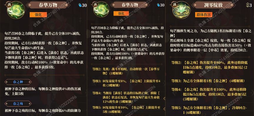 「春华万物」:技能持续期间,我方队友持续获得「春之种」—减伤效果,并且持续治疗,满层获得复活效果,「满春」状态下获得灵气;敌方持续获得「春之殇」—降低防御。