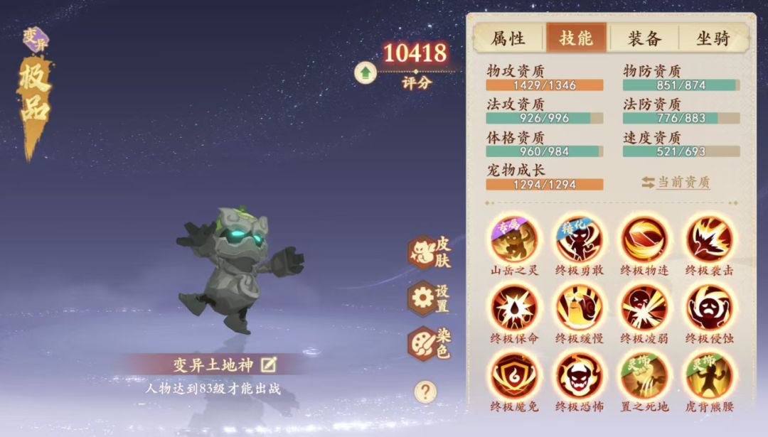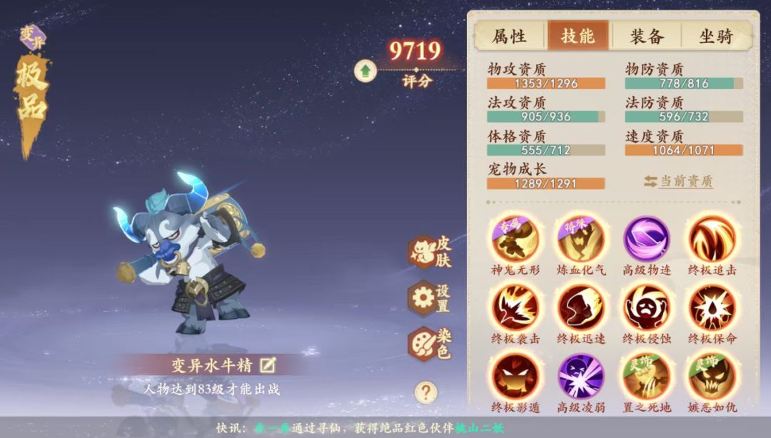 资质成长:(对比四阶神兽猴)+36攻击,-44物防,-218体格,-98法防,+241速度,+11成长