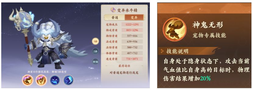 这个牛和73隐攻鸡、隐攻神兽猴的用法一样,但是需要注意一个点,大水牛的1技能被动需要对方血量比自己高才能有伤害加成。因为速度资质比较高而且是5力加点,所以可以不打迅速。因为隐攻基本只需要成长、速度、攻击,因为有被动,洗出来的牛成长速度攻击高就可以,体格越低越好!