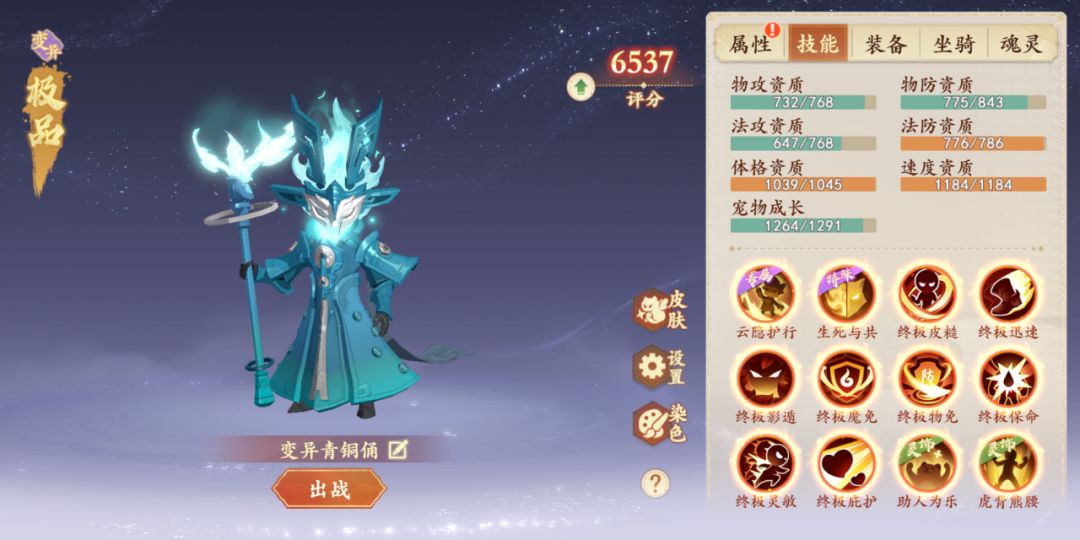 这是一只非常强的配速宝宝,这个成长和资质满级后达到1900速度面板是完全没有问题的,像很多双封队伍的一速封以后也多了个选择,极限速度不需要无脑5敏,可以选择首发带一个青铜俑,然后卡好他的速度就行了。80级后天师有6级审判卡,不再是无脑洞察卡了,可以偷一手影遁技能。