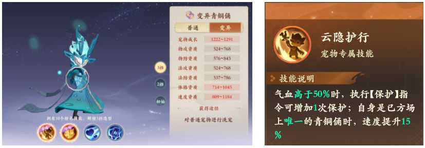 卡奶妈或者二速封的配速,这个被动的存在能让宝宝坦度上升了一大截,非常的好用,但是有一个问题,他并不能代替魔礼海,因为护佑技能非常的强,而且护佑技能是两回合,给队友给宝宝上完护佑,魔礼海下回合也能解封能复活能加血能再贴个保护,青铜俑并没有这个功能。