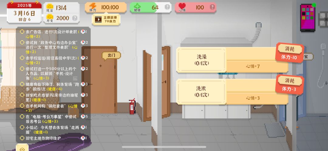 游戏的最右边可以去洗澡,可以缓解疲劳增加心情,是前期最省力的一个增加心情的方法之一。