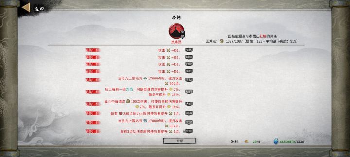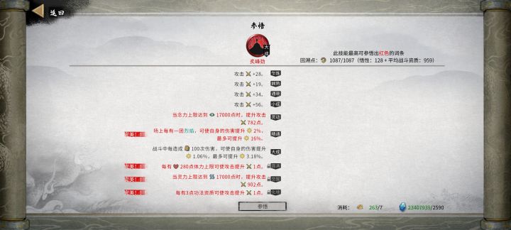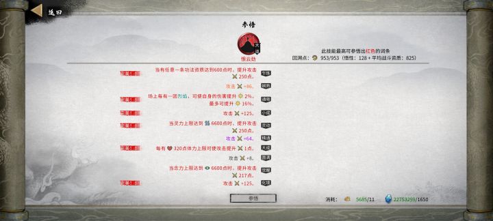 首先将悟道境劲功法的6个主要词条洗完美,(资质➕悟性高,可以保留多个红色词条,很容易洗出来)如图二