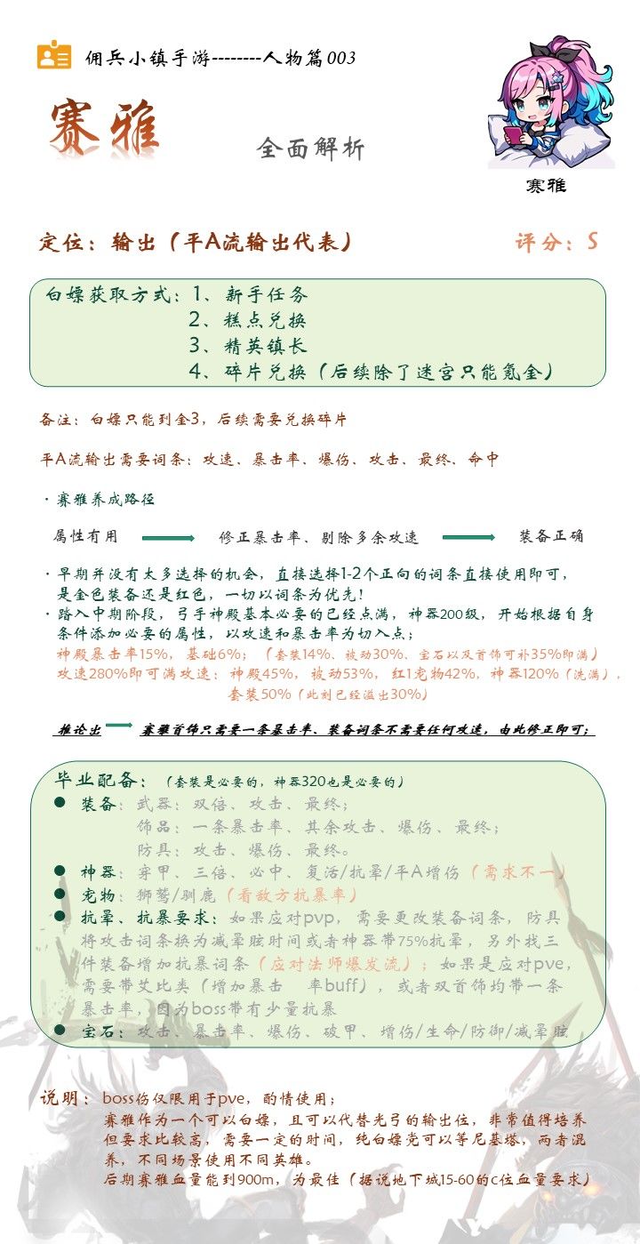 纯白嫖党也是可以享受的一个角色,非常的全方位。培养到位的甚至比光弓还要出色(光弓只是拥有不俗的地下城能力,但主要能力无法适用于boss,所以赛雅是可以与之相比的)