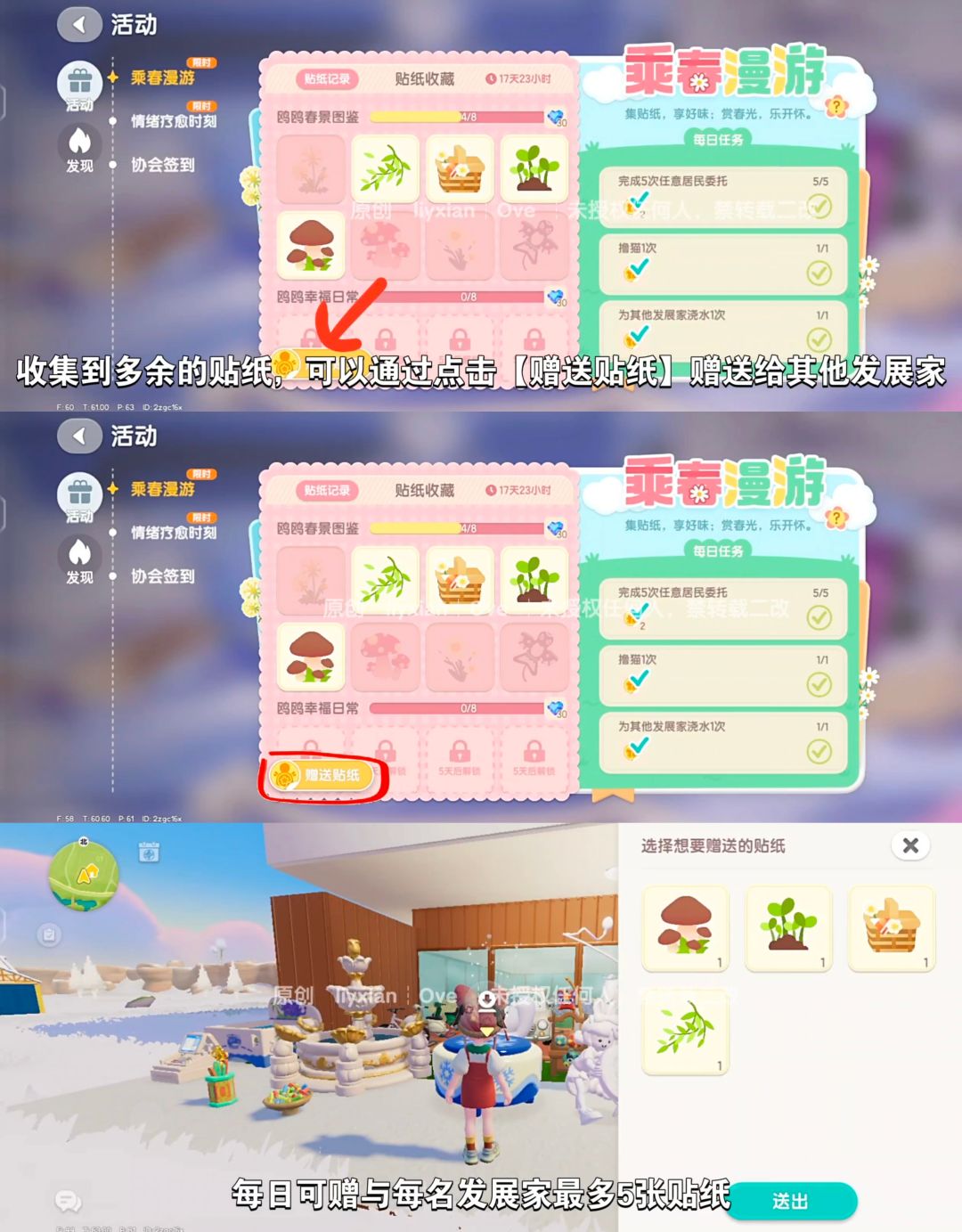收集到多余的贴纸,可以通过点击【赠送贴纸】赠送给其他发展家,每日可赠与每名发展家最多5张贴纸。