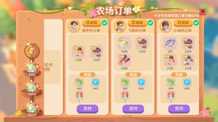4.今天更新农场种地时间缩短了,推荐做经验高的订单,惊喜订单还会给扩地材料,现在农场订单性价比很高。