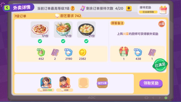 2.送材料的时候不要着急领,因为如果仓库上限了,就会浪费材料,推荐等做菜材料不够再领,不会影响送菜cd。