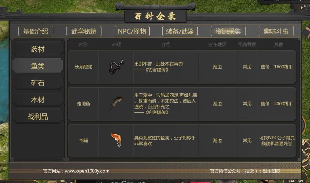 鱼竿:才体验钓鱼的玩家可以直接去竹林里面找到竹子,然后进行砍伐,再使用砍到的竹子去找到游戏中的NPC风兄,再用刚刚砍伐的竹子跟他去兑换翠竹鱼竿,这样初学者就拥有一个属于自己的渔具啦。要是资深玩家的话,还可以去金食堂里面进行购买,那里鱼竿的品质会更好一点,品质越好的鱼竿钓鱼的难度则越低,而且钓到的鱼品质也会更好。鱼饵:鱼竿有了之后,那就是需要去获得一下鱼饵了,初学者可以直接去找铁匠购买蚯蚓就可以了,资深玩家的话,也可以去金食堂进行购买,与鱼竿一样,品质越好的鱼饵钓到鱼高级鱼的可能性就会越大,鱼竿关乎的是钓鱼难度,鱼饵则是鱼上钩的几率,两种工具都非常的重要,品质越好,钓鱼难度则越低,鱼的品质则越高。