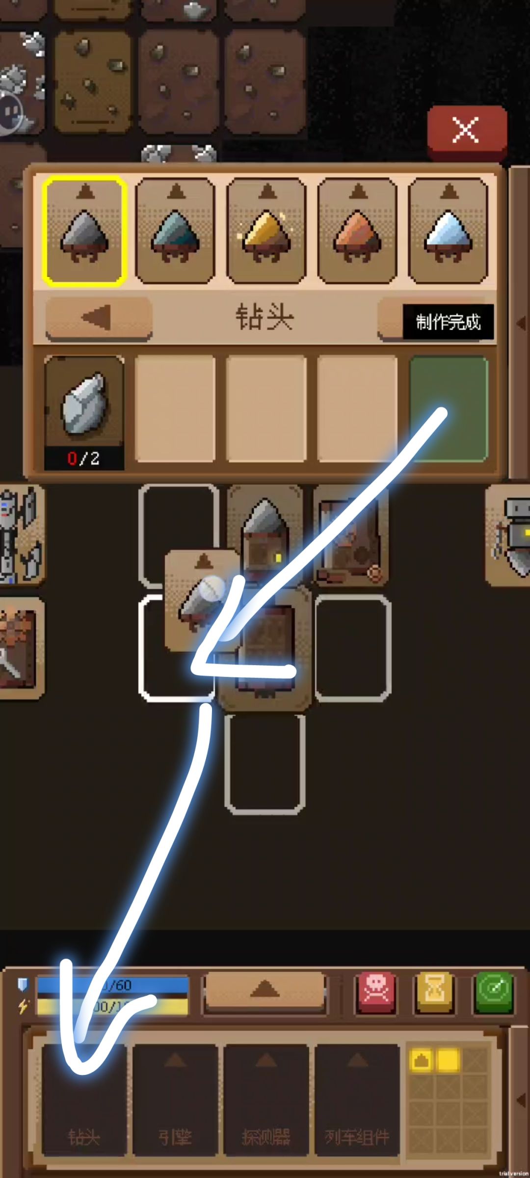 制造“钻头”,手指滑动放在地上、再次滑动放在车头的“钻头”装备上,车头面板绿色探测仪查看周围矿石
