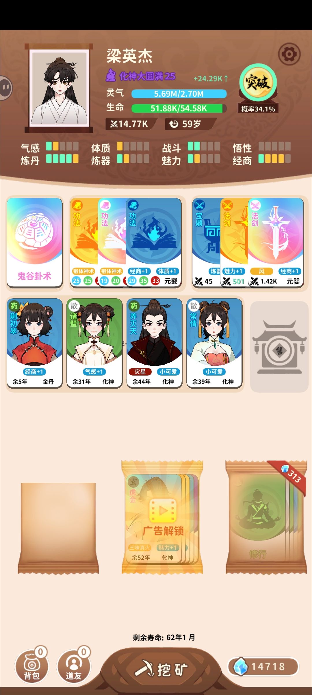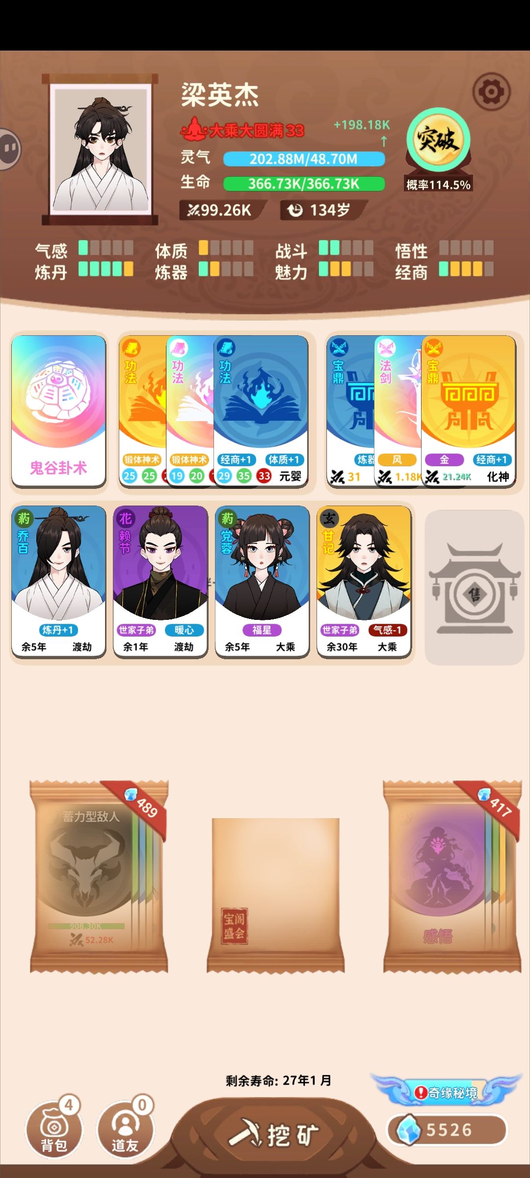 然后最难的是大乘大圆满,前面有商店都能包过,需要多刷几次商店,然后抽灵植也只抽金色的,其他的没什么提升,最后攒满几率突破(不攒满也行,因为这套体系灵气多太多,百分之五十几率多试几次就可以了)