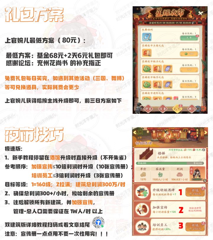 更新内容:优化了最早版本的上官婉儿方案,目前裸氪104即可,如提前开启【三国】/【舞狮】活动可提前兑换【宣传册】,进一步减少消耗