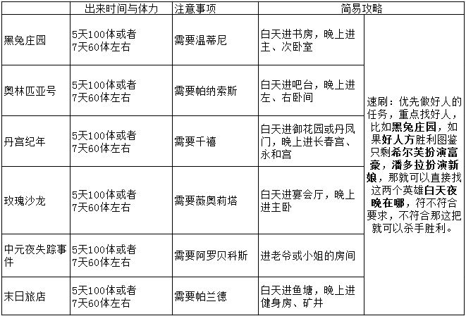 剧本鲨都是一个玩法,玩过一遍就知道其他也是这样玩。首先,剧本鲨要等自然时间解锁扮演角色和英雄。出来时间见下图。剧本鲨有英雄参战任务,也是49+1模式。比如黑兔庄园,如果你没有温蒂尼,那么建议就七天出来,硬要五天要花太多体力(150体)了,不值。这里说一下,剧本鲨任务都是:30结局任务+50英雄参战任务+12扫荡次数任务。因此根据自身情况,看英雄缺多少而开不开剧本鲨。但总的来说7天是可以出来的,无非是多花一些体力。