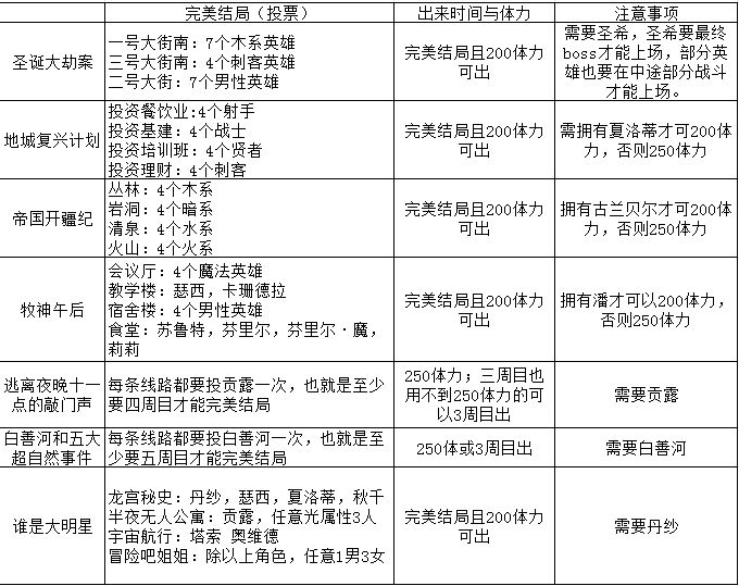 阿卡迪亚就不说了,前面说过。大事件都有英雄参战任务,也是49+1。下图是参战英雄齐全的情况。完美结局也是在tap上找的,就都放这了(据说英雄数量四个就行,大劫案那个攻略有点老了)。大事件如果参战英雄不齐(49+1中的49),并且战力不能打难度40的,不建议去开。