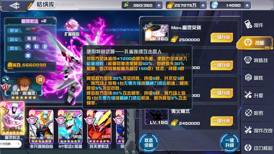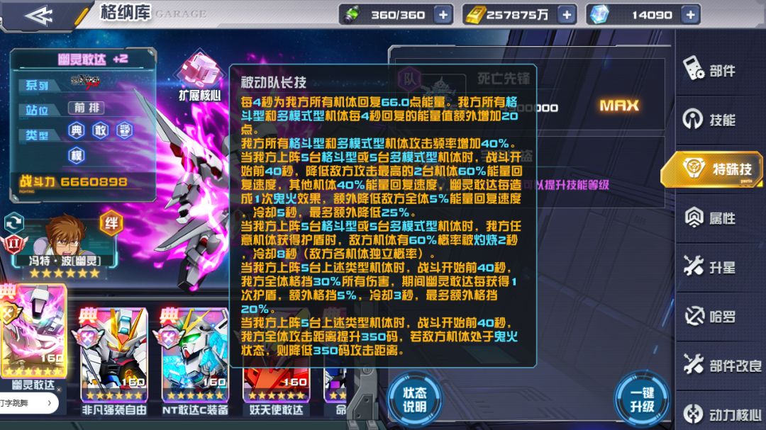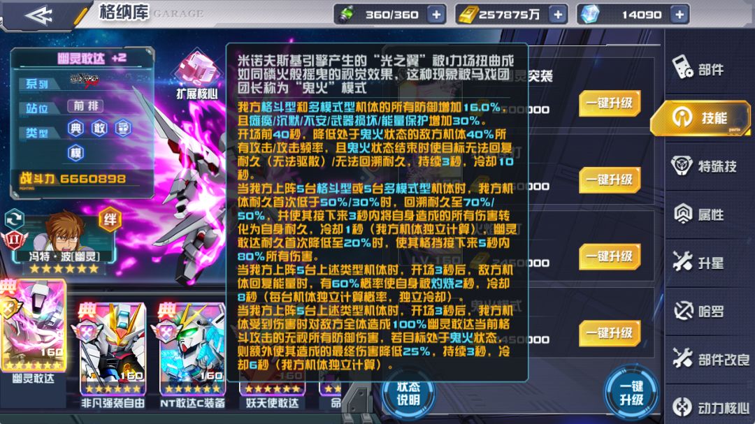 当我方上阵5台格斗型或5台多模式型机体时,战斗开始前40秒,降低敌方攻击最高的2台机体60%能量回复速度,其他机体40%能量回复速度,幽灵敢达每造成1次鬼火效果,额外降低敌方全体5%能量回复速度,冷却5秒,最多额外降低25%。