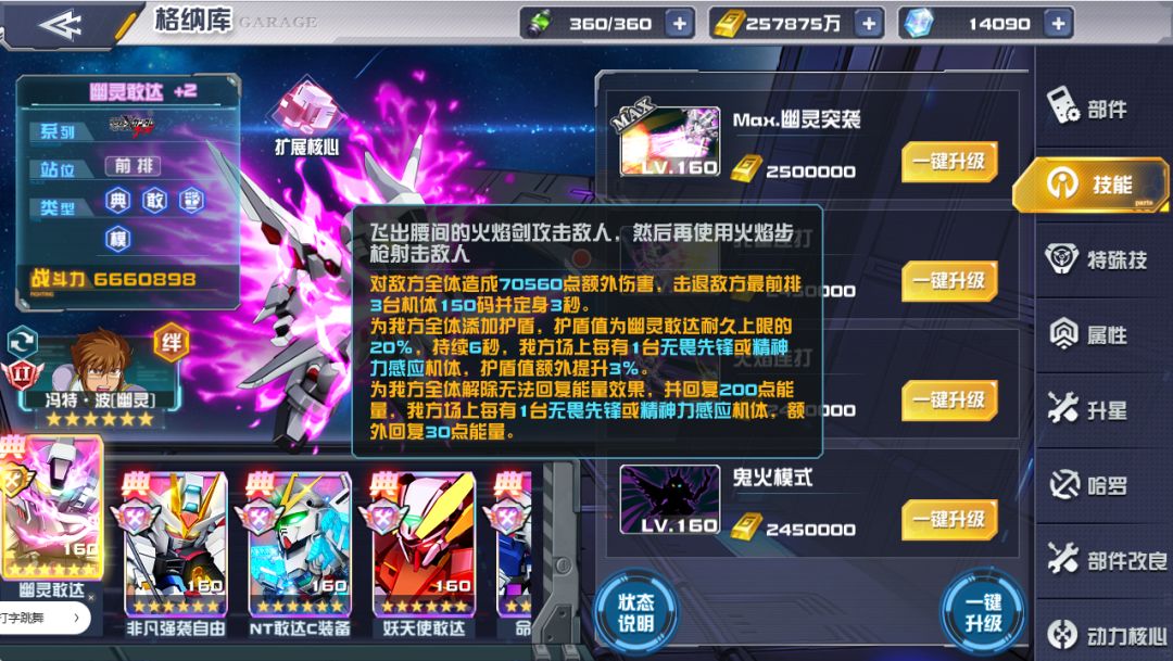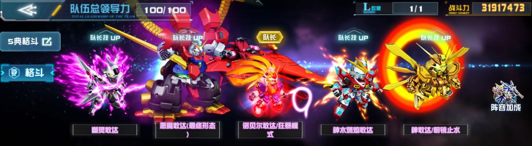 幽灵敢达的鬼火状态搭配我方其他格斗机体的输出能够强力增幅格斗队伍的输出,反击护盾则为格斗队伍的反打助力。以上种种使得格斗队伍胜率大增。