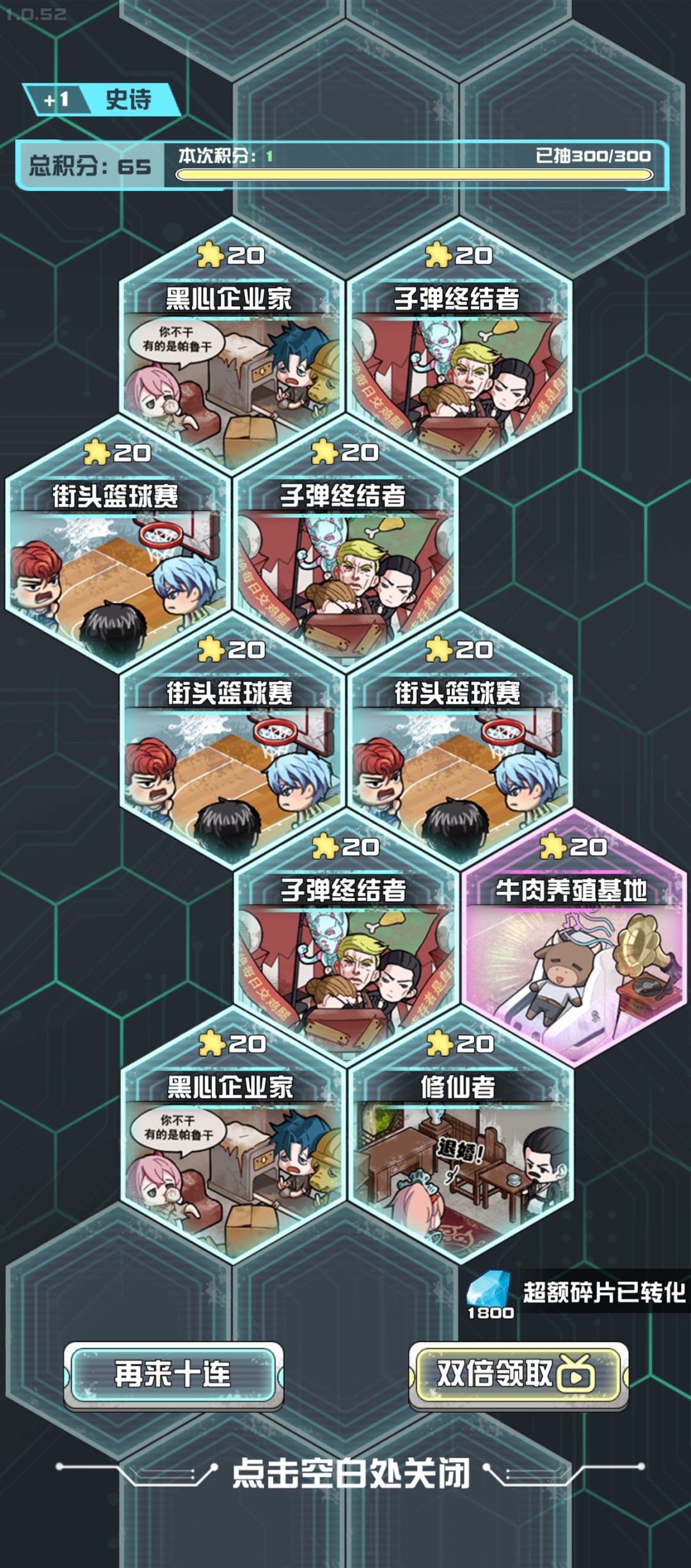 2.就用这种方法开始十连抽,抽出来后看看有没有两个及以上的6480钻,如果有,就点【双倍领取】;如果没有就继续【再来十连】。看广告的方法就用1.的。搞差不多120w钻石。20分钟撑死了!