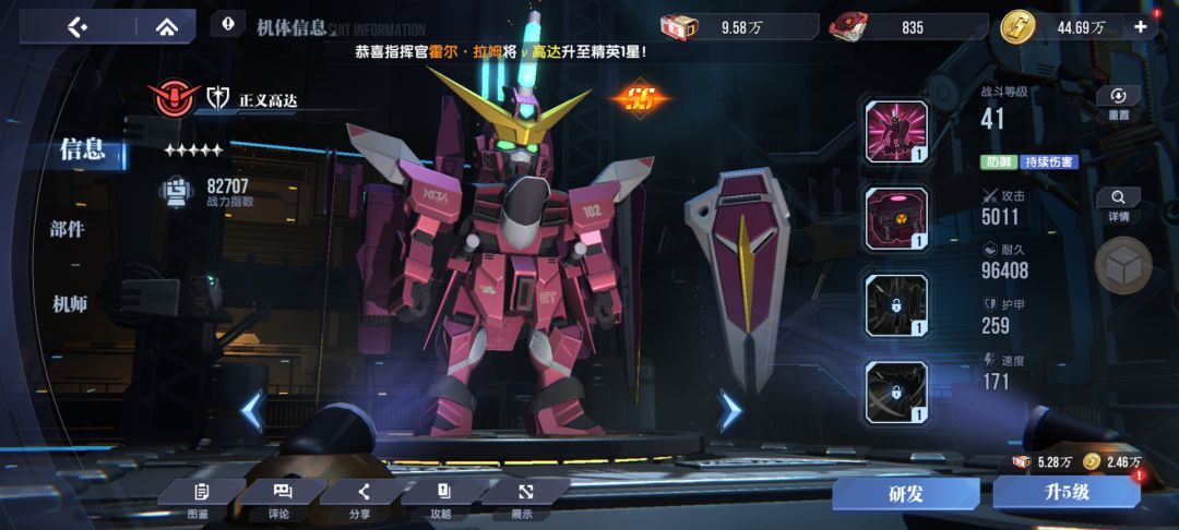 前期大家都能抽到的正义高达,我非常建议养,因为战斗开局就会放一波全屏技能,甚至直接通关,推图非常舒服!前期建议无脑拉等级,框框砸资源!而且后期还能加入主流燃烧队,必练啊,兄弟!