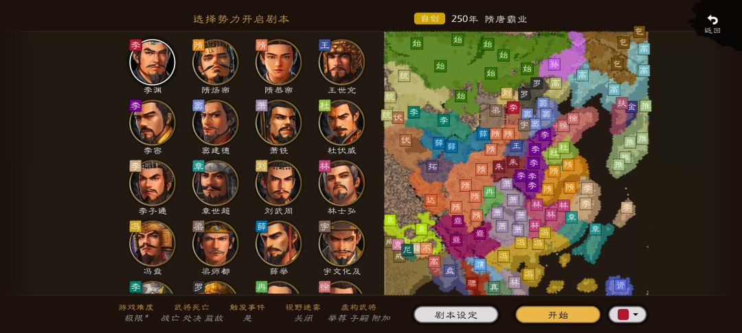 3、重点隋末霸业主打史实(260个隋朝自建武将+子嗣和举荐),专为追求史实的玩家。