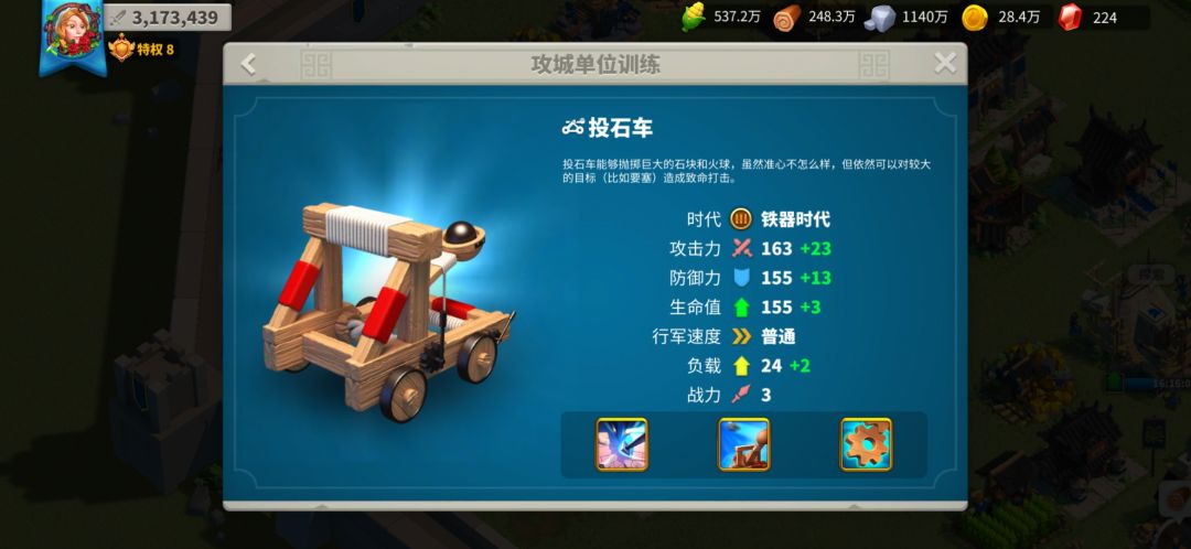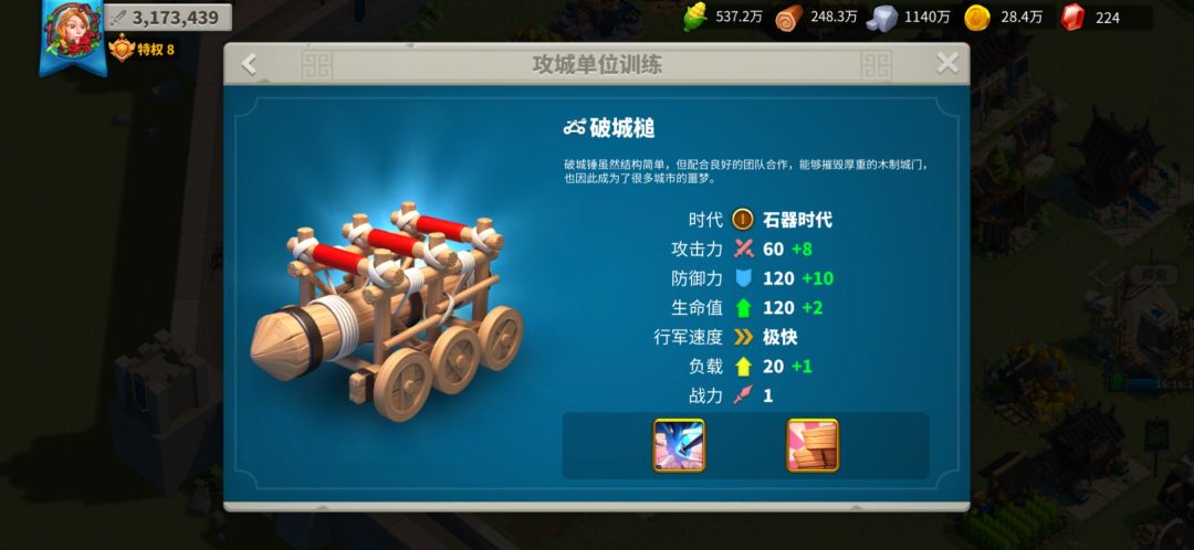 并且2级攻城兵是造一级时间的2倍,3级是2级的两倍。所以我们这里推荐没有特殊活动时候我们只造一级的攻城车,快速,廉价。我们的总兵力又不会有限制,何乐不为呢~