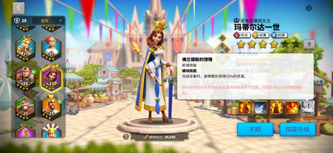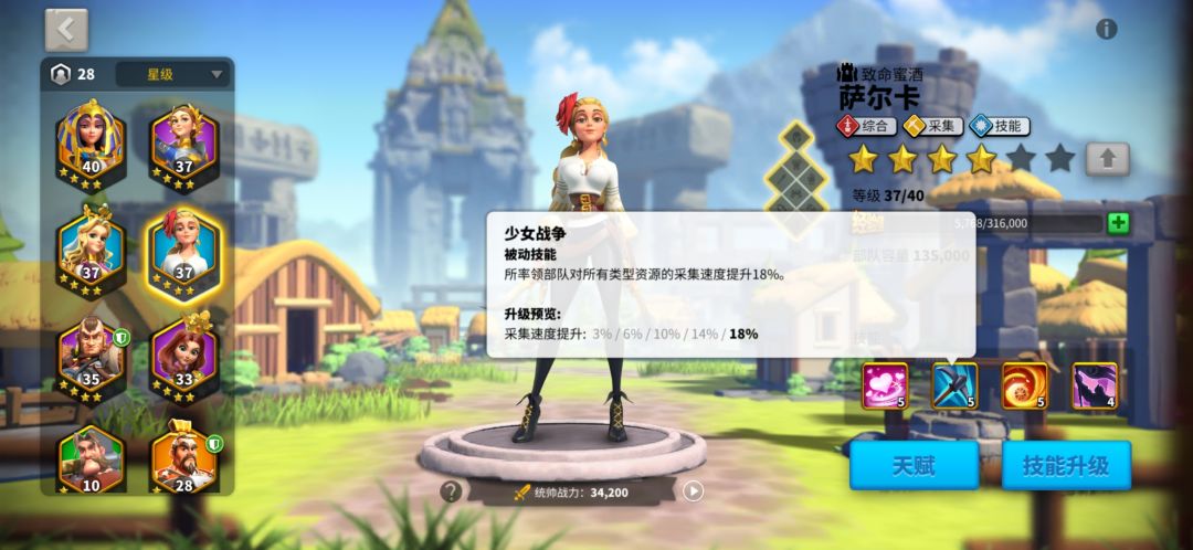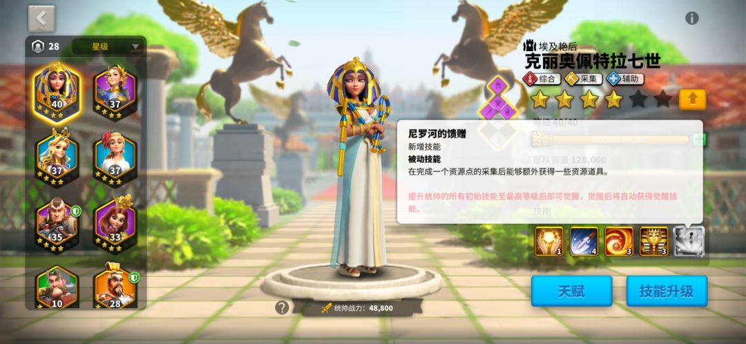 第三,采集将领的选择。新人都会送一个贞德,一个埃及艳后,但我建议平民把埃及艳后卡住10级卡出2技能升满就好。负载在游戏中期并不是很重要,有人说我的兵都不够采集,这里说一个点,我们的攻城兵基本就是用来采集负载物资用的。