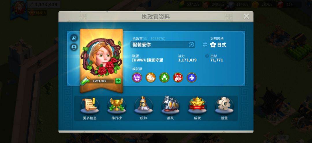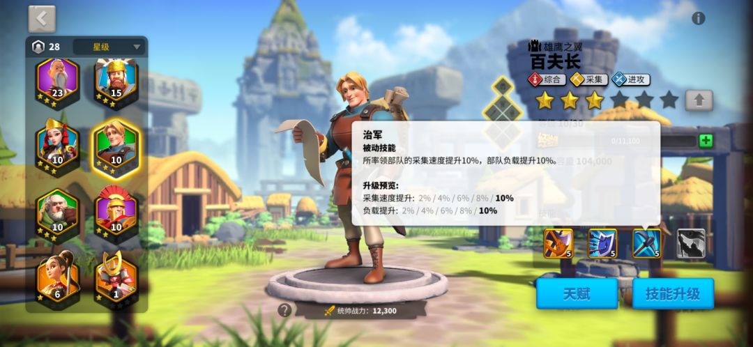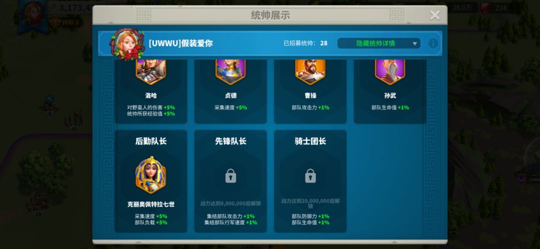 第二,在左上角头像的统帅一栏中,可以分派将领,这里有两个官位,都可以加百分之5采集速度。