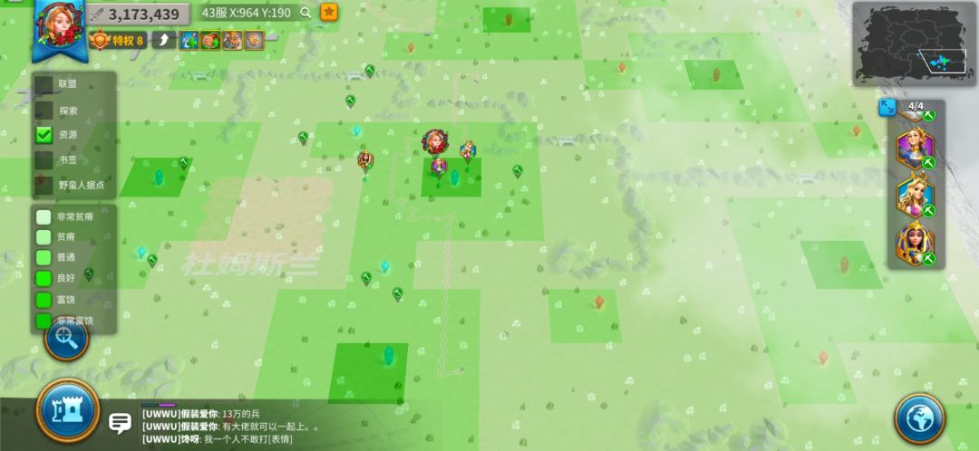 你可以在大地图左边一栏有联盟 ,探索和资源。你点开资源会看到颜色越深的地方资源点等级越高,也越方便我们不需要经常性的在路上来回和经常得顾着游戏放不开的问题。