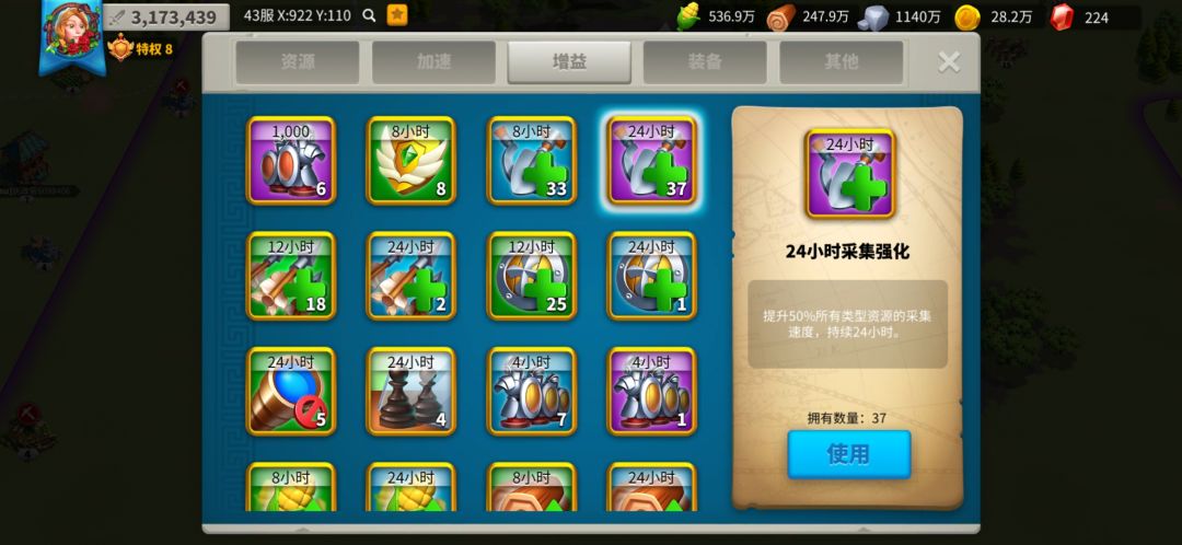 第7点。几乎不要停的是用采集加成道具,这个在商店都能买到。8小时或者24小时百分之50的加速。