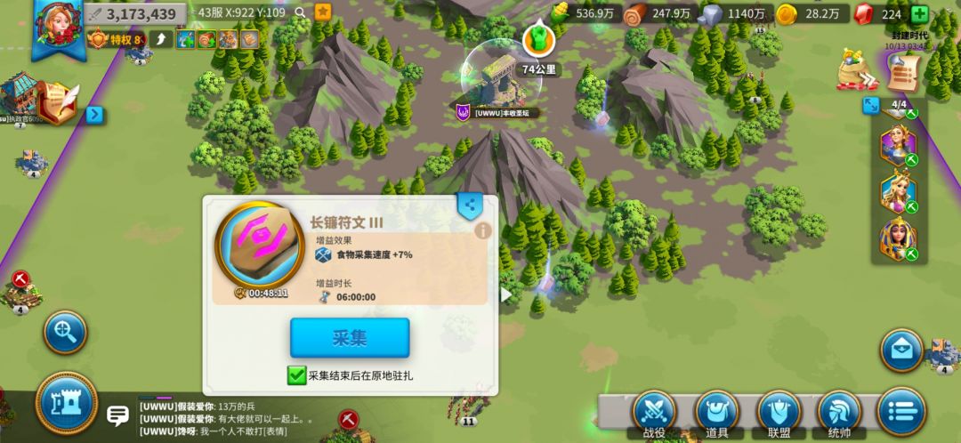 到这里基本和采集相关该注意的就是这些了,还有一些公会有什么48小时能开的8小时加速。你注意一下就好。万国觉醒毕竟还只是一款休闲养成战略游戏,希望各位不要太肝太氪。后续我还会发一些平民和土豪武将培养攻略以及一些我玩万国的心得,各位可以关注我~希望在这里能帮到各位。