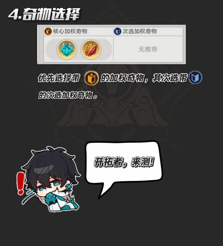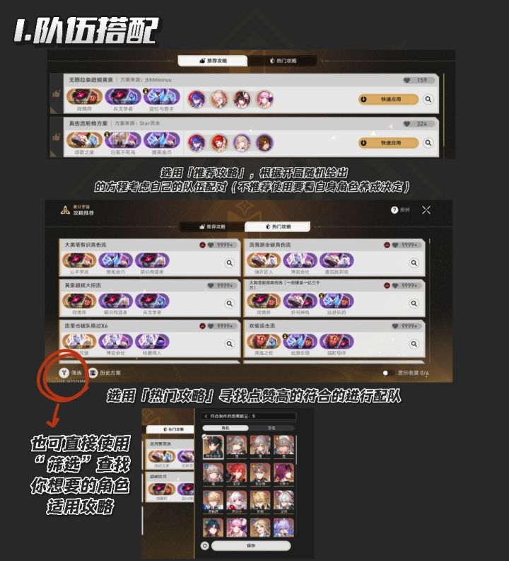 开局先选用「局内攻略」,可以考虑选择「推荐攻略」或「热门攻略」。「推荐攻略」:根据开局随机方程给出的队伍搭配(不推荐选用 需要考虑自身角色的养成情况决定)「热门攻略」:可以直接使用“筛选”寻找出适合自己的角色的配队。