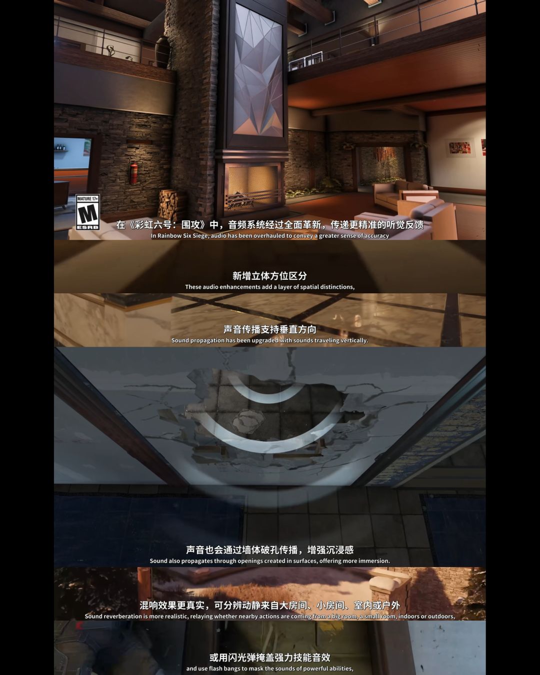 ⑥音频系统升级,终终终于解决了他的音频BUG了,这下不会上下层声音bug了。音频更新为立体音频,可以听到来自四面八方的声音,并且声音会根据场景进行变化,不同场景下反馈不同,且受传播介质影响。另外一个就是大家都用了好几年的“声音战术”。