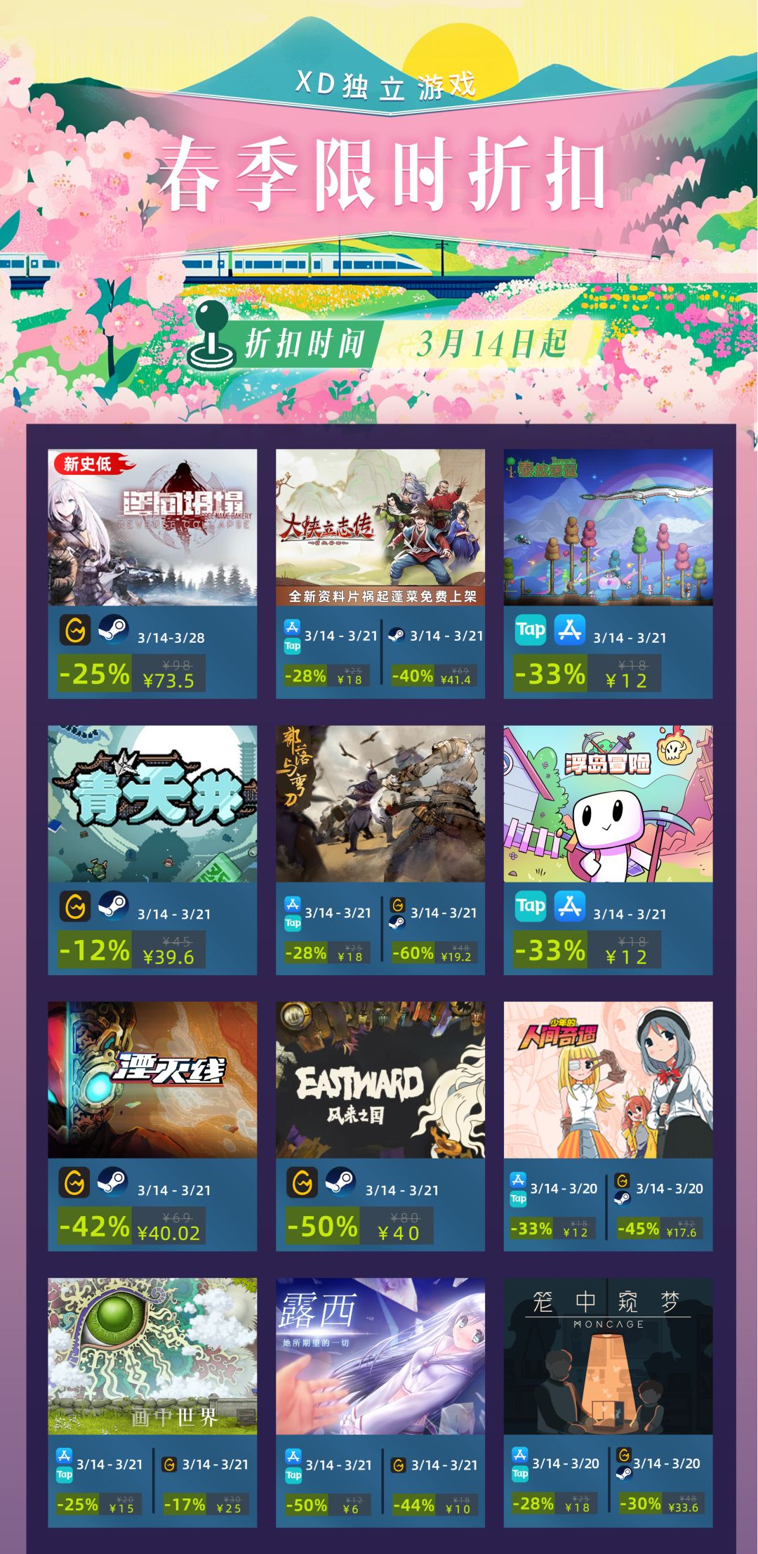 《画中世界》在今天会开启移动端15元,PC端25元的限时折扣价,持续到3月21日。其他XD独立游戏的折扣时间等信息,我们也把汇总图片放在文末,方便大家查看了!