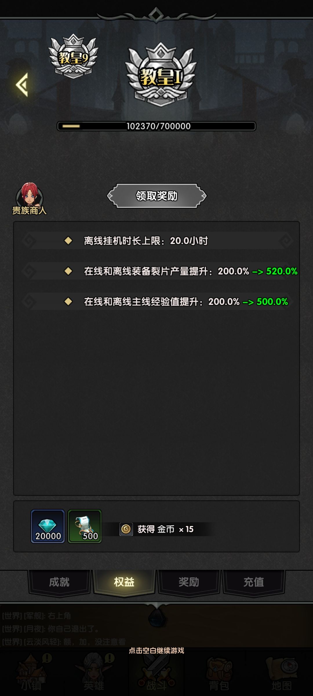 20.关于声望,商店的买满以后,优先把1图的5w挂满,后期刷经验效率就一直靠1图的进阶了,毕竟boss好打,我大概一天地图经验在5000左右,在线30s重置据说最快一天可以有2w地图经验。然后2图和3图主要是挂上来买背包,有实力的大佬也可以刷普通图,但是普通氪度肯定做不到了。