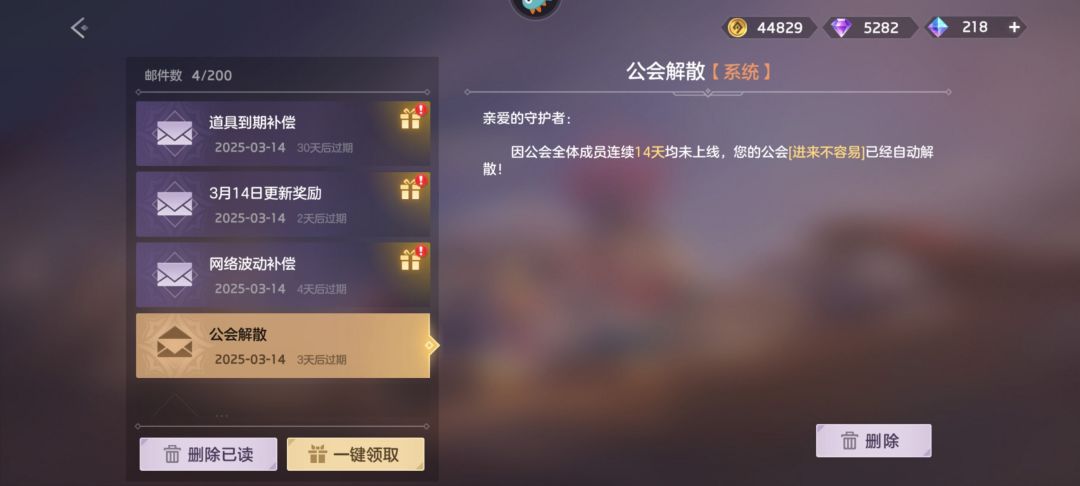 然后是这个,第三号,之前工会会长退游,会长位置自动给我了,当时看的工会全部都退游七天以上,我当时没管,没多久我第三号也退游了,结果今天上线就看到这,工会自动解散,工会里面三十个人啊,全部吃干饭的,都不回归,属实逆天